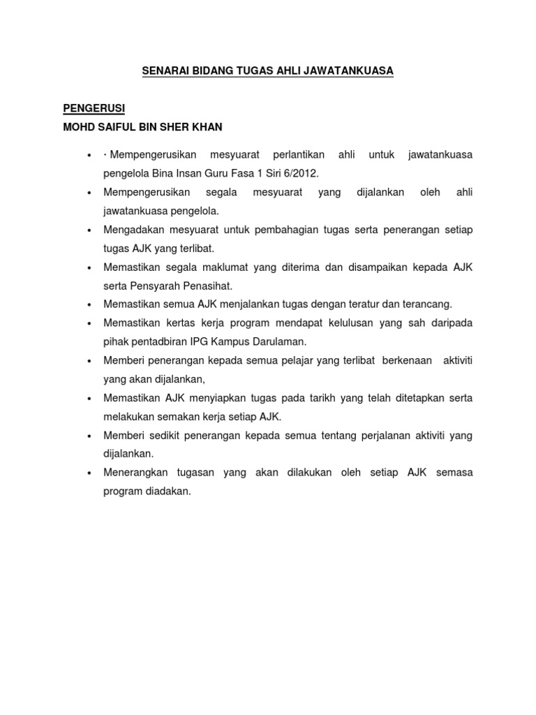 1.0 senarai senara i tugas ahli jawa jawatankuasa pengarah. .di pengeru.sikan oleh yb senator tan sri dato' seri utama dr. Download senarai tugas ahli jawatankuasa projek. Mendapatkan senarai nama ahli jawatan kuasa serta para pegawai daripada ahli jawatan kuasa yang terlibat untuk dimasukkan dalam buku program. Penyelaras nur syuhada bt mohamad setiausaha :